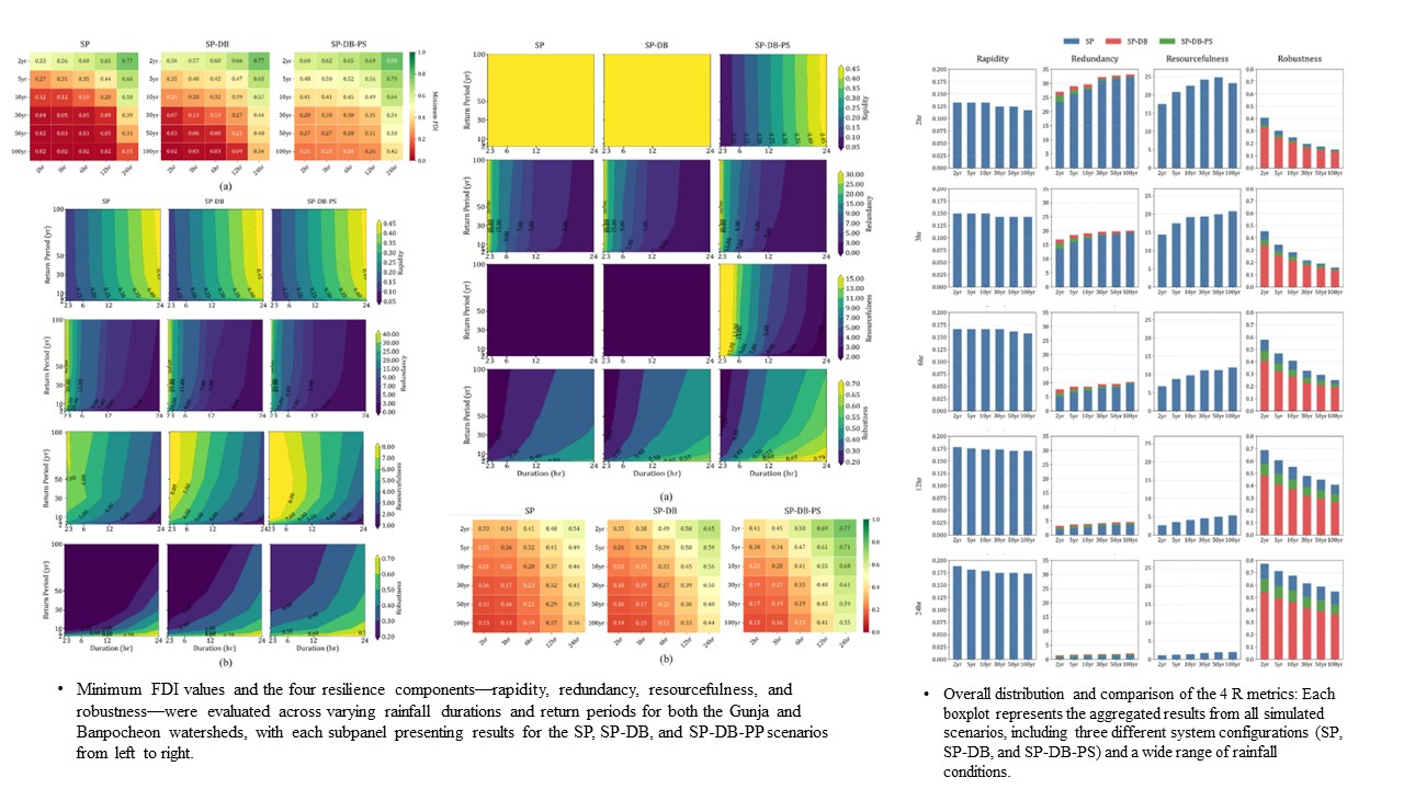 해당 프레임워크는 서울시 내 두 도시 유역을 대상으로 적용되었으며, 다양한 인프라 조합 시나리오 비교 결과 우수배수관망(블루 인프라)과 저류지(그린 인프라)와 펌프(그레이 인프라)를 결합한 복합 시스템(SP-DB-PP)이 가장 높은 홍수 방어 성능을 보이는 것으로 나타났다. 특히 극한 강우 상황에서도 안정적 대응이 가능하다는 점이 확인되며, 향후 도시형 침수 대응 전략 수립의 효용성이 입증됐다. 또한 실제 강우 사례와 설계 강우의 비교 분석에서 높은 일치도가 확보되어, 제안된 프레임워크의 현장 적용 가능성도 확인되었다.