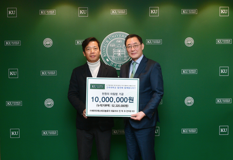 진덕수 대표는 “학생들이 든든하게 끼니를 챙길 수 있는 훌륭한 사업에 뜻을 보탤 수 있어 기쁘다”며, “앞으로도 꾸준히 건국대에 기부를 이어갈 계획이다”라고 기부 소감을 밝혔다.
